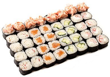 Васаби, имбирь, соевый соус, Филадельфия макси, Филадельфия в огурце, Классика спайс лосось, Классика лосось с тобико,