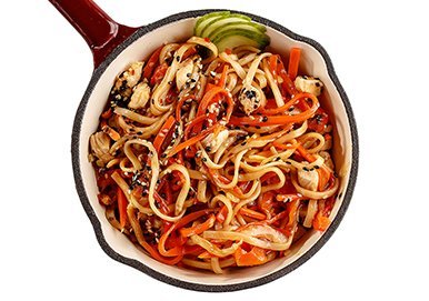 Креветки, Кунжут, Лосось, Морковь, Пекинская капуста, Перец болгарский , Чеснок , Пшеничная лапша Удон, Кальмар, Мидии, Осьминог,